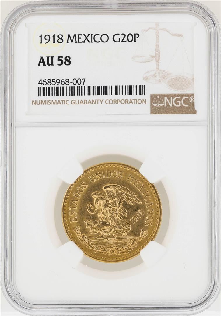 One 1918 Mexico 20 Pesos Gold Coin NGC AU58. NGC Certified.