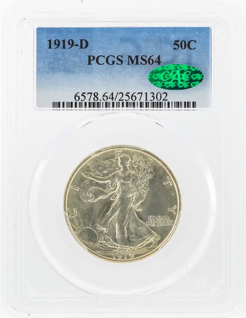 1919-D Liberty Walking Half Dollar Coin PCGS Graded MS64 CAC. This is a 1921-S half dollar that is considered a conditionally rare issue in the Walking Liberty series. The average certified grade of this mintage is below VF20, so finding such a fine example is increasingly rare. PCGS has only certified 212 Mint State 1921-S half dollars, the lowest total of the series. This Choice Mint State piece has indistinct central details including the gown lines and hand at her waist. PCGS Graded.