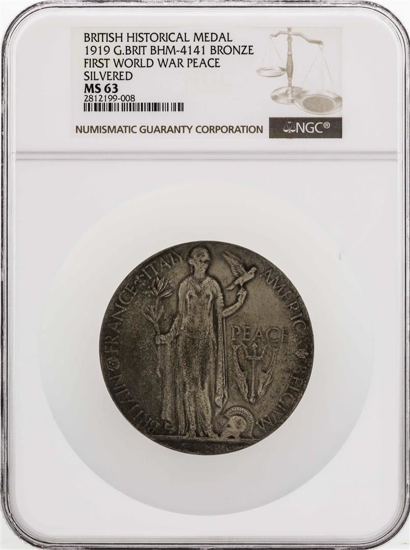 One 1919 Great Britain BHM-4141 Bronze Medal First World War Peace Silvered NGC MS63. NGC Certified.