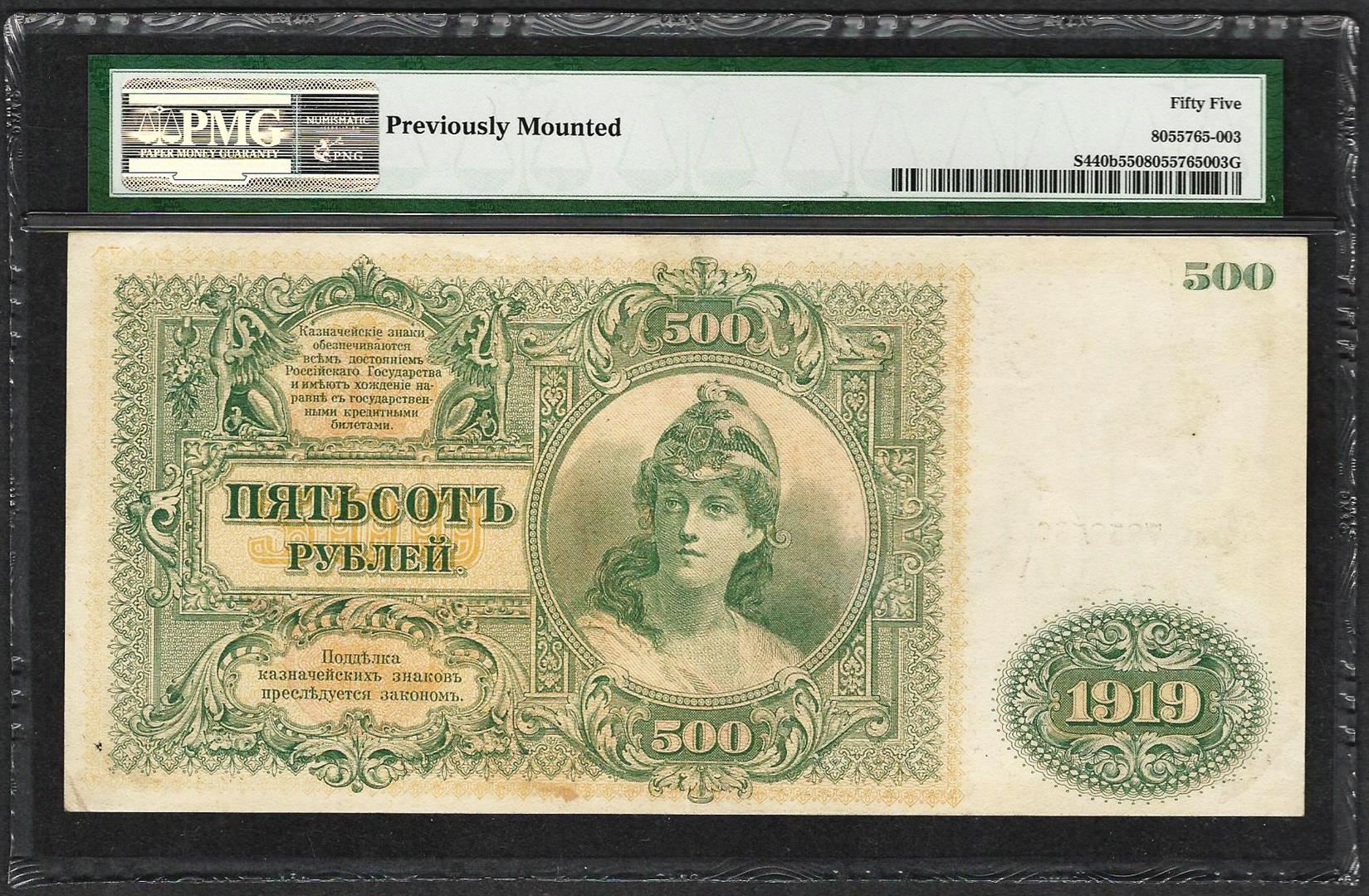 One 1919 South Government Bank Russia 500 Rubles Pick# S440b PMG About Uncirculated 55. PMG Certified.