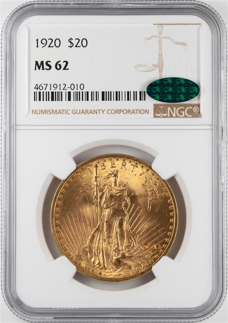 One 1920 $20 St. Gaudens Double Eagle Gold Coin NGC MS62 CAC. NGC Certified.