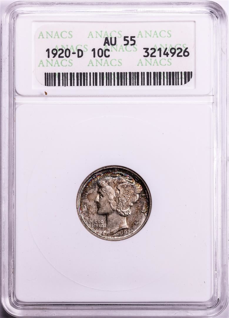 One 1920-D Mercury Dime Coin ANACS AU55 Old Soap Box Holder. ANACS Certified.