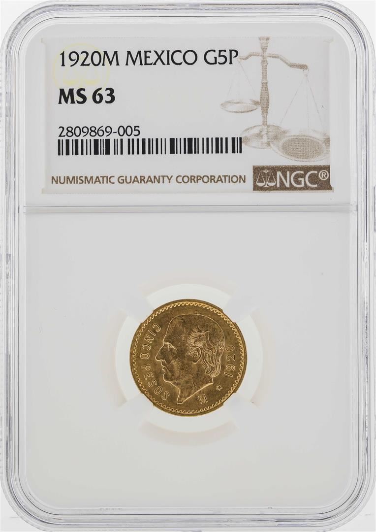 One 1920-M Mexico 5 Peso Gold Coin NGC MS63. NGC Certified.