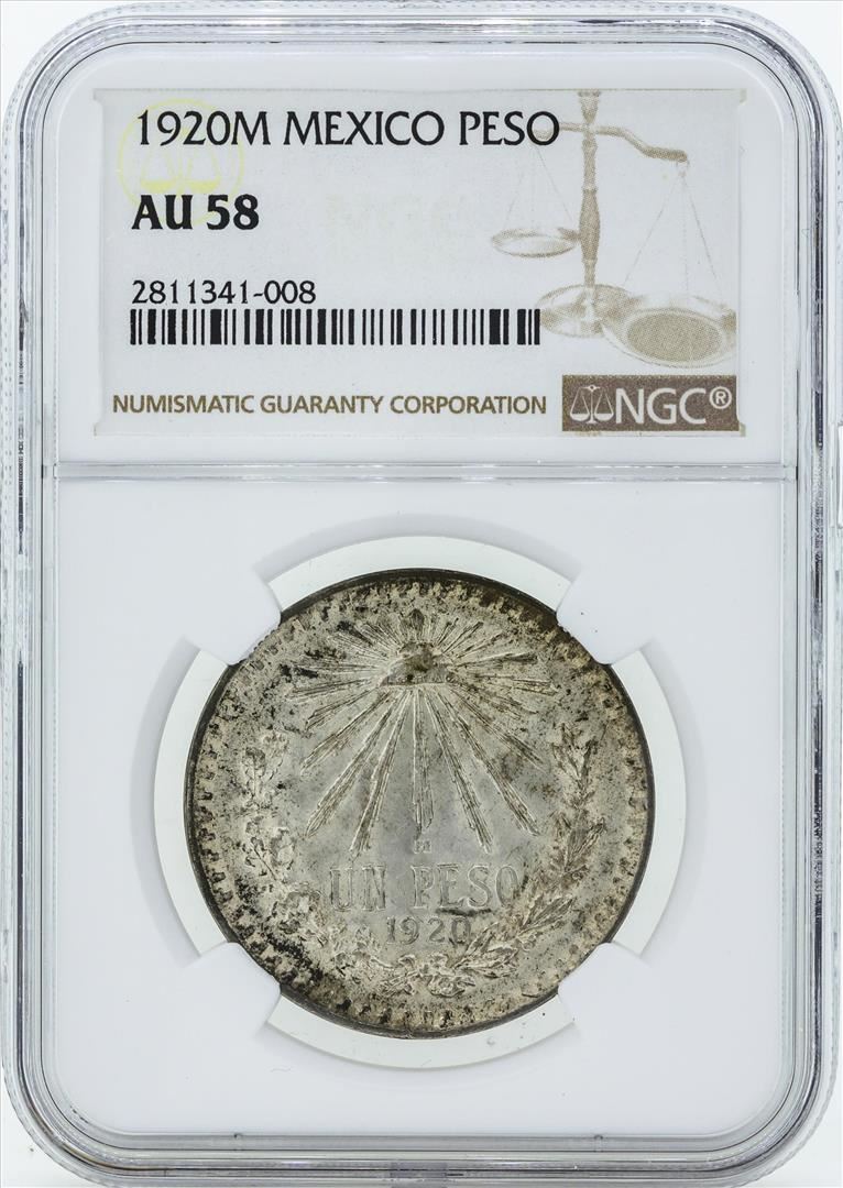 One 1920M Mexico Peso Coin NGC AU58. NGC Certified.