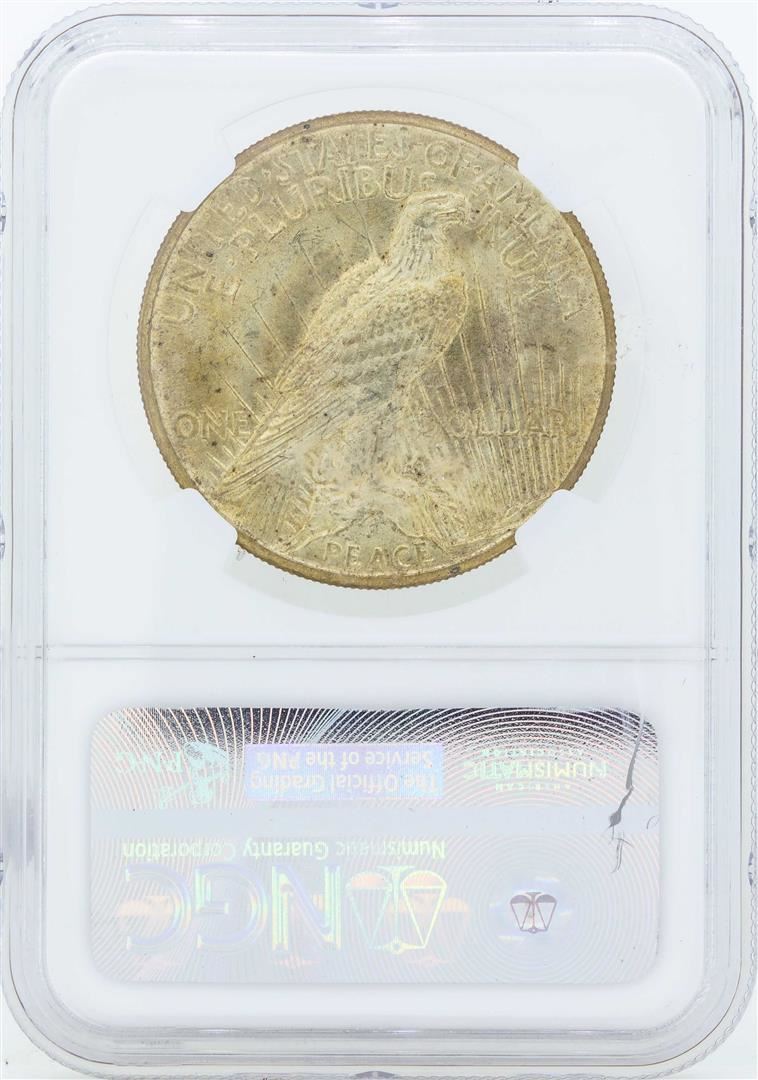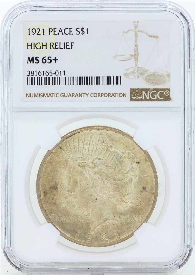 One 1921 $1 High Relief Peace Silver Dollar Coin NGC MS65+. NGC Certified.