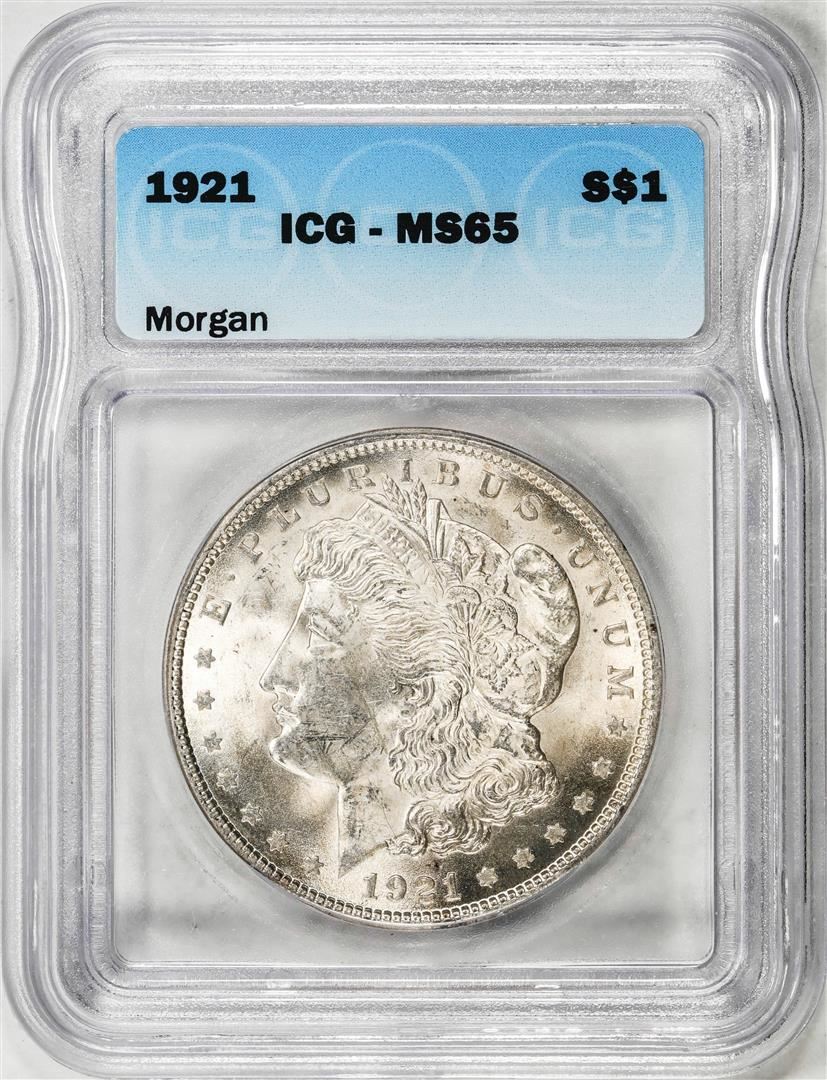 One 1921 $1 Morgan Silver Dollar Coin ICG MS65. ICG Certified.