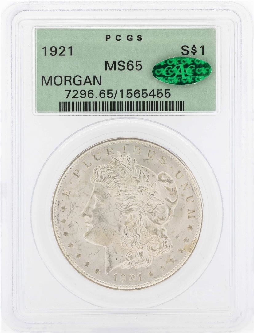 One 1921 $1 Morgan Silver Dollar Coin PCGS MS65 CAC. PCGS Graded.