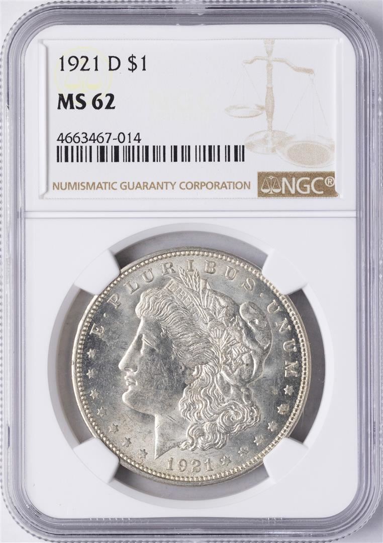 One 1921-D $1 Morgan Silver Dollar Coin NGC MS62. NGC Certified.