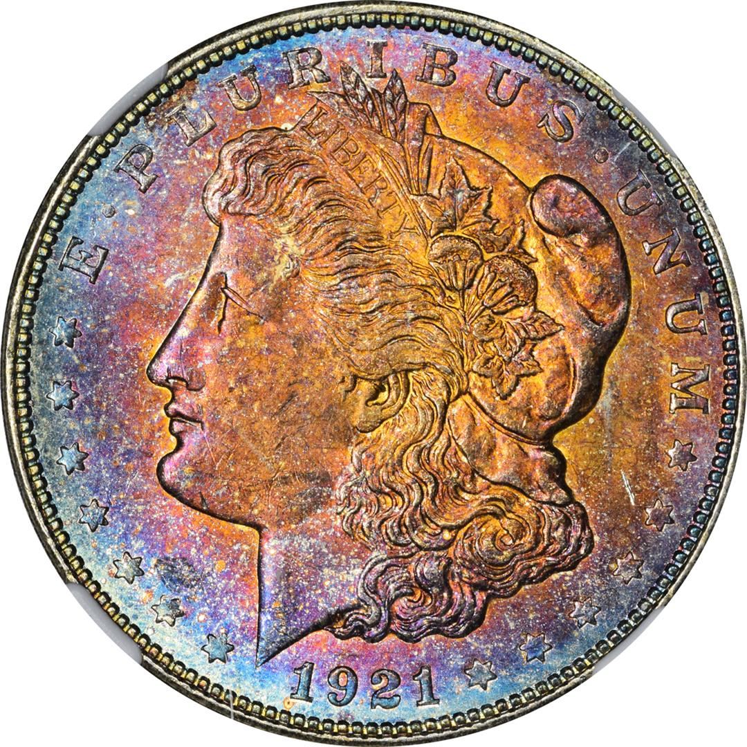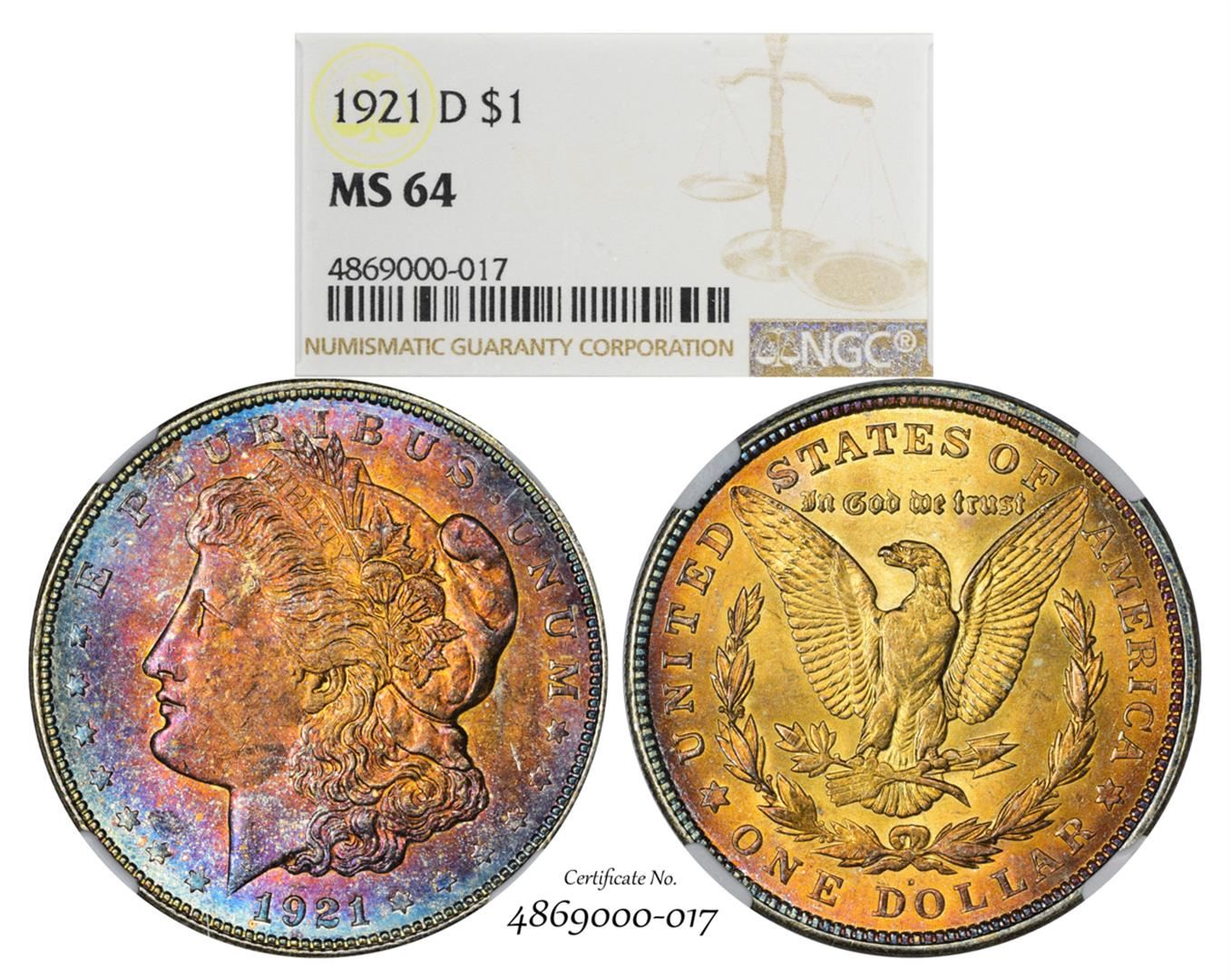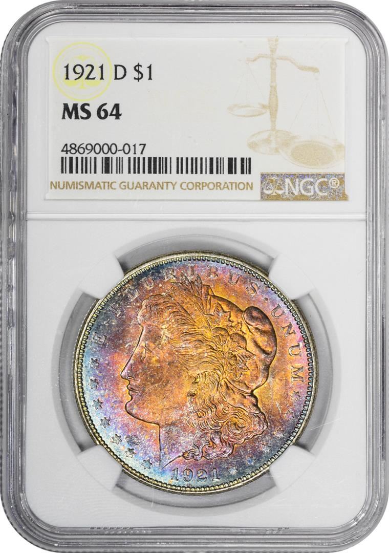 One 1921-D $1 Morgan Silver Dollar Coin NGC MS64 Amazing Toning. NGC Certified.
