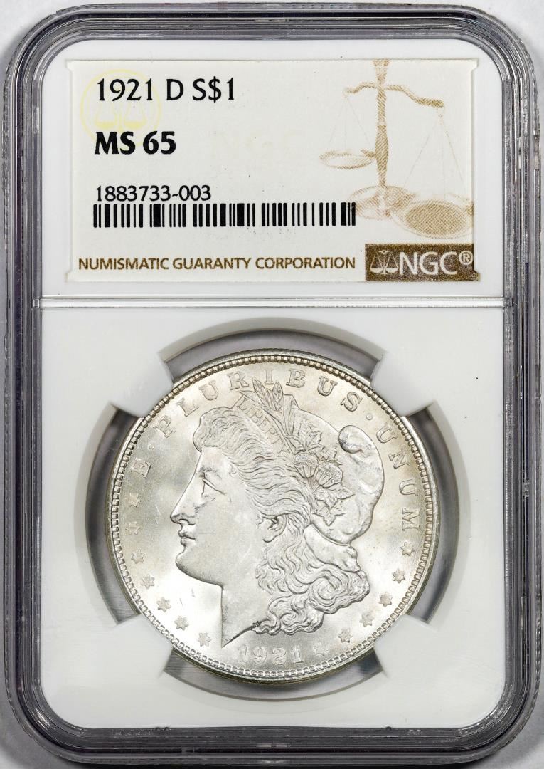One 1921-D $1 Morgan Silver Dollar Coin NGC MS65.