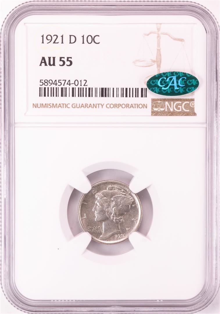 One 1921-D Mercury Dime Coin NGC AU55 CAC. NGC Certified.