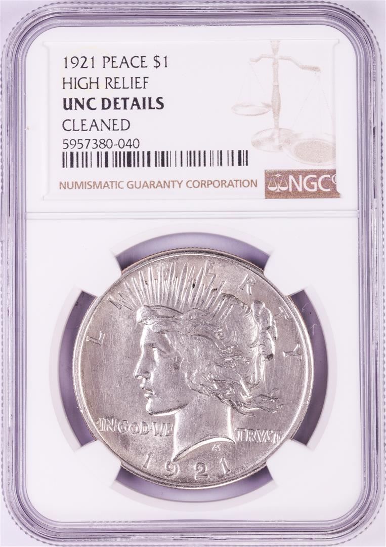 One 1921 High Relief $1 Peace Silver Dollar Coin NGC Unc Details. NGC Certified.