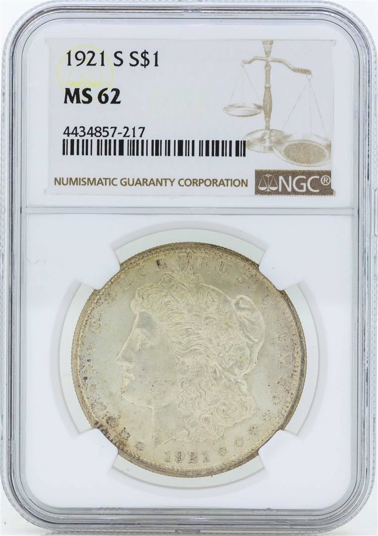 One 1921-S $1 Morgan Silver Dollar Coin NGC MS62. NGC Certified.