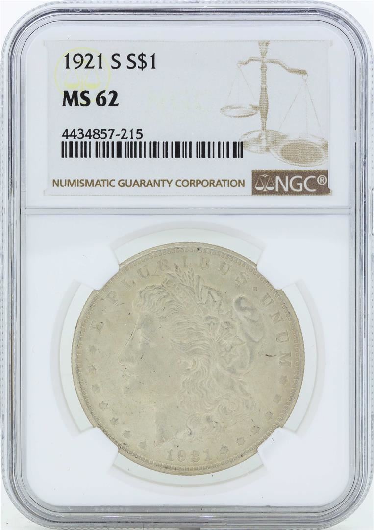 One 1921-S $1 Morgan Silver Dollar Coin NGC MS62. NGC Certified.