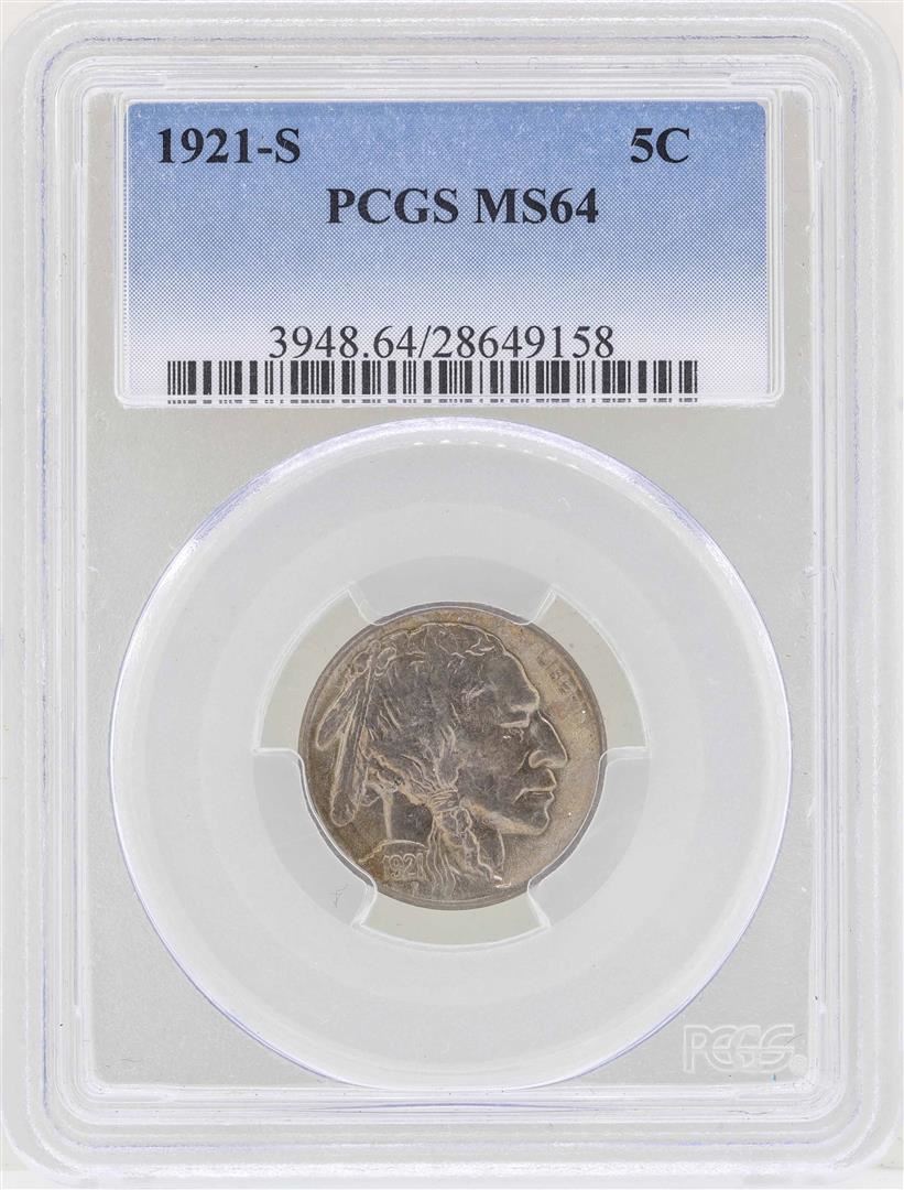 One 1921-S Buffalo Nickel Coin PCGS MS64. PCGS Graded.