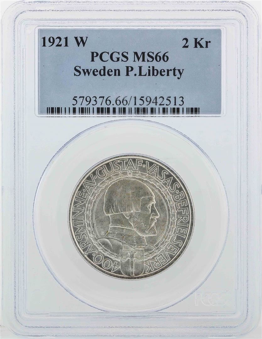 One 1921-W Sweden P. Liberty 2 Kroner Coin PCGS MS66. PCGS Graded.