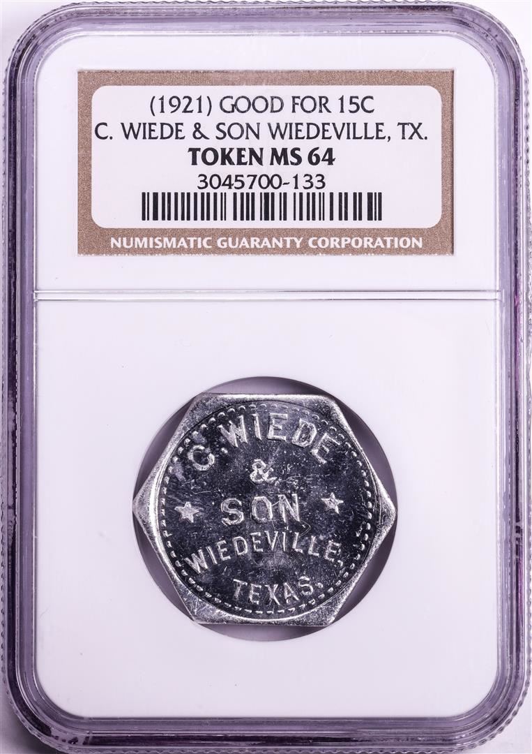 One 1921 Wiedeville, TX Good for 15C C. Wiede & Son Token NGC MS64. NGC Certified.