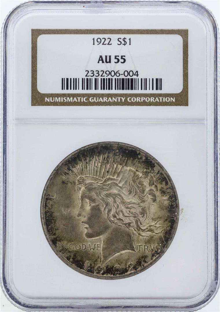 One 1922 $1 Peace Silver Dollar Coin NGC AU55. NGC Certified.