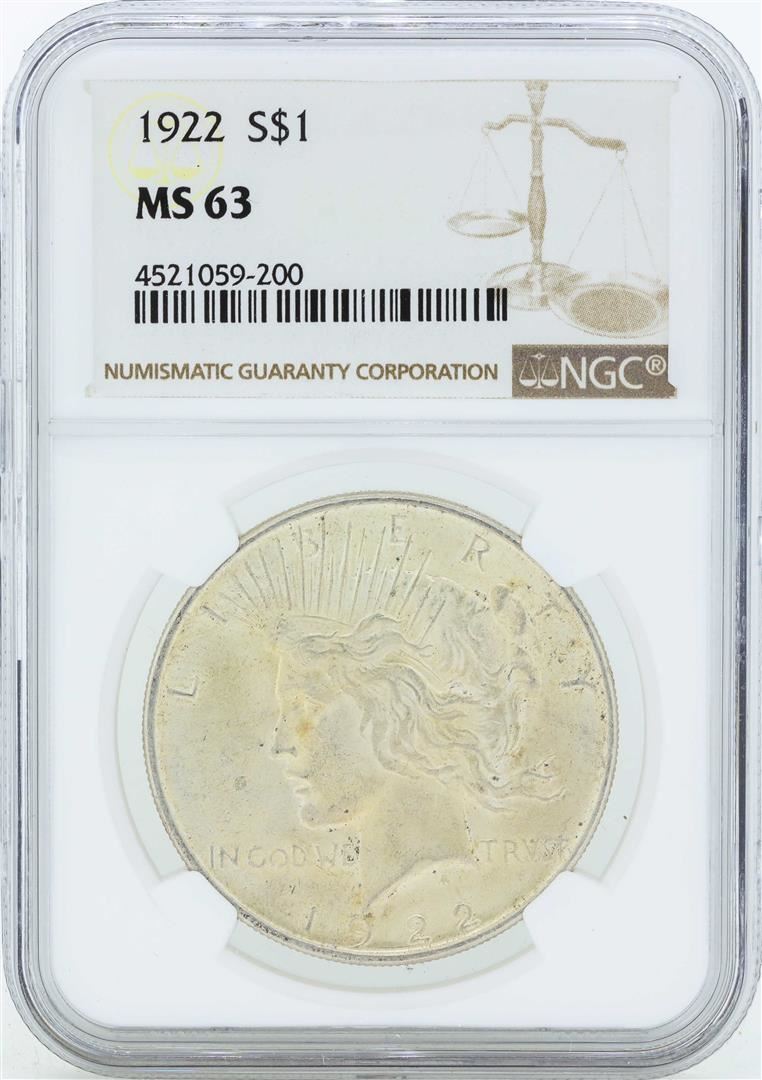 One 1922 $1 Peace Silver Dollar Coin NGC MS63. NGC Certified.