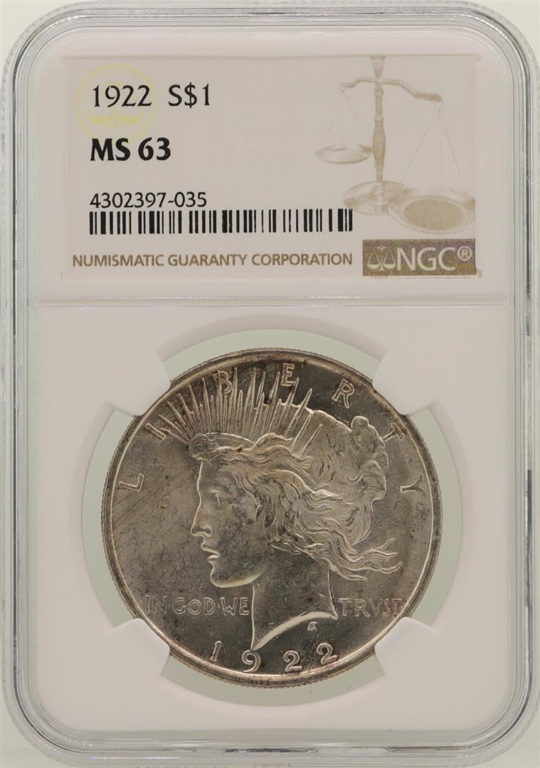 One 1922 $1 Peace Silver Dollar Coin NGC MS63. NGC Certified.