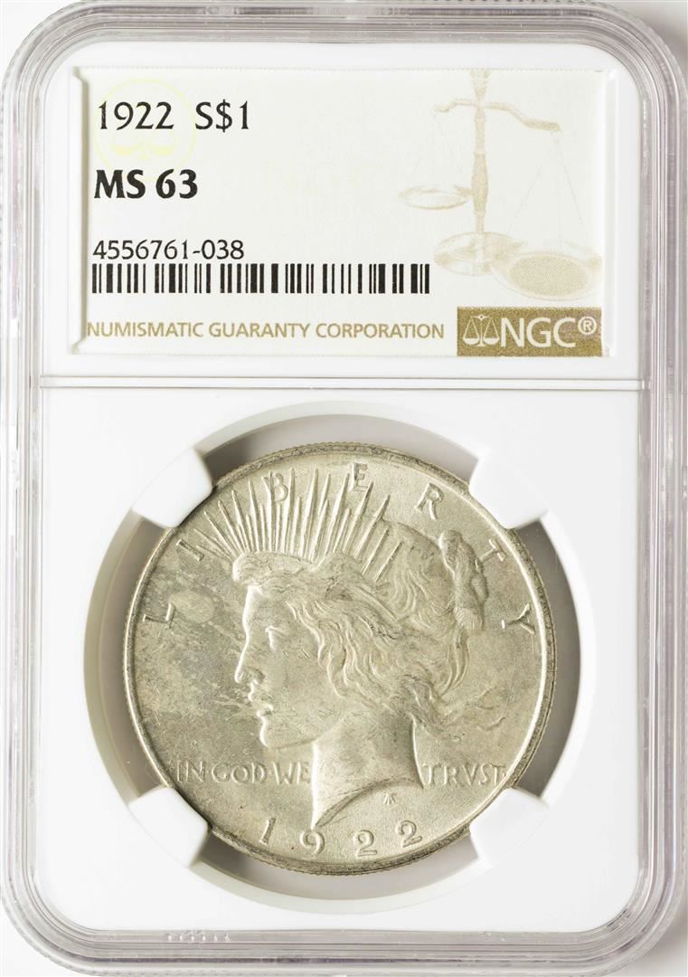 One 1922 $1 Peace Silver Dollar Coin NGC MS63. NGC Certified.