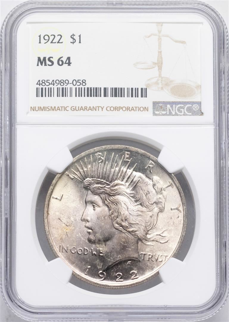 One 1922 $1 Peace Silver Dollar Coin NGC MS64. NGC Certified.