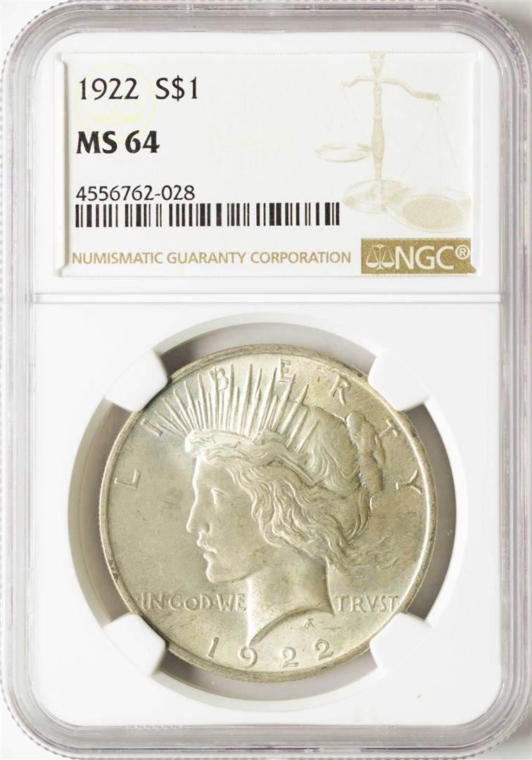 One 1922 $1 Peace Silver Dollar Coin NGC MS64. NGC Certified.