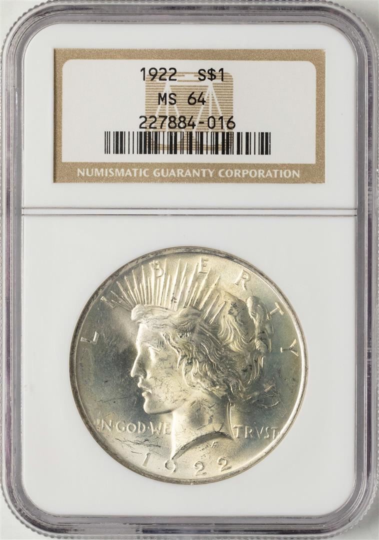 One 1922 $1 Peace Silver Dollar Coin NGC MS64. NGC Certified.