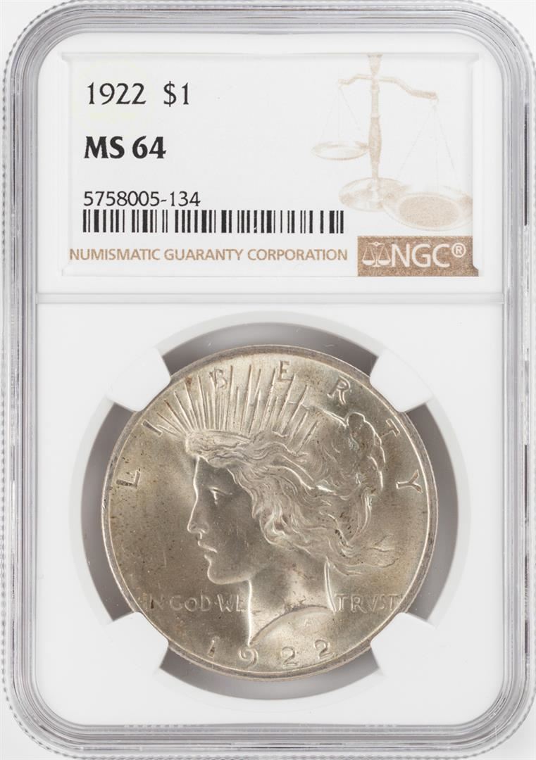 One 1922 $1 Peace Silver Dollar Coin NGC MS64. NGC Certified.