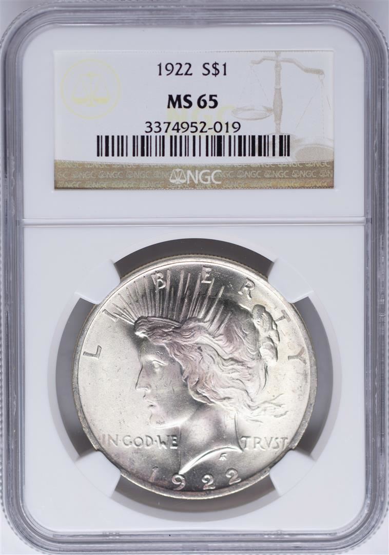 One 1922 $1 Peace Silver Dollar Coin NGC MS65 Nice Toning. NGC Certified.