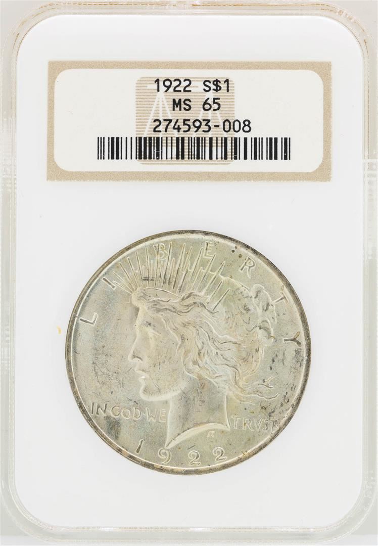 One 1922 $1 Peace Silver Dollar Coin NGC MS65. NGC Certified.