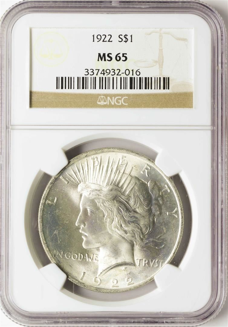 One 1922 $1 Peace Silver Dollar Coin NGC MS65. NGC Certified.