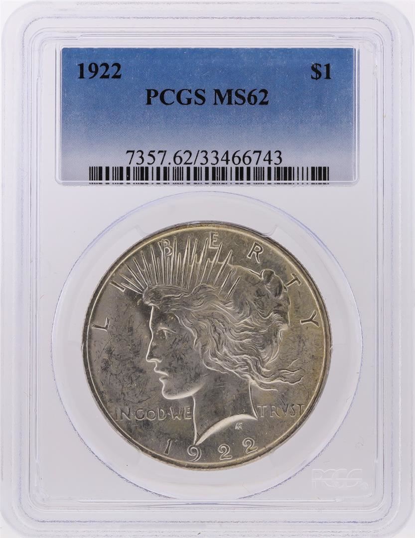 One 1922 $1 Peace Silver Dollar Coin PCGS MS62. PCGS Graded.