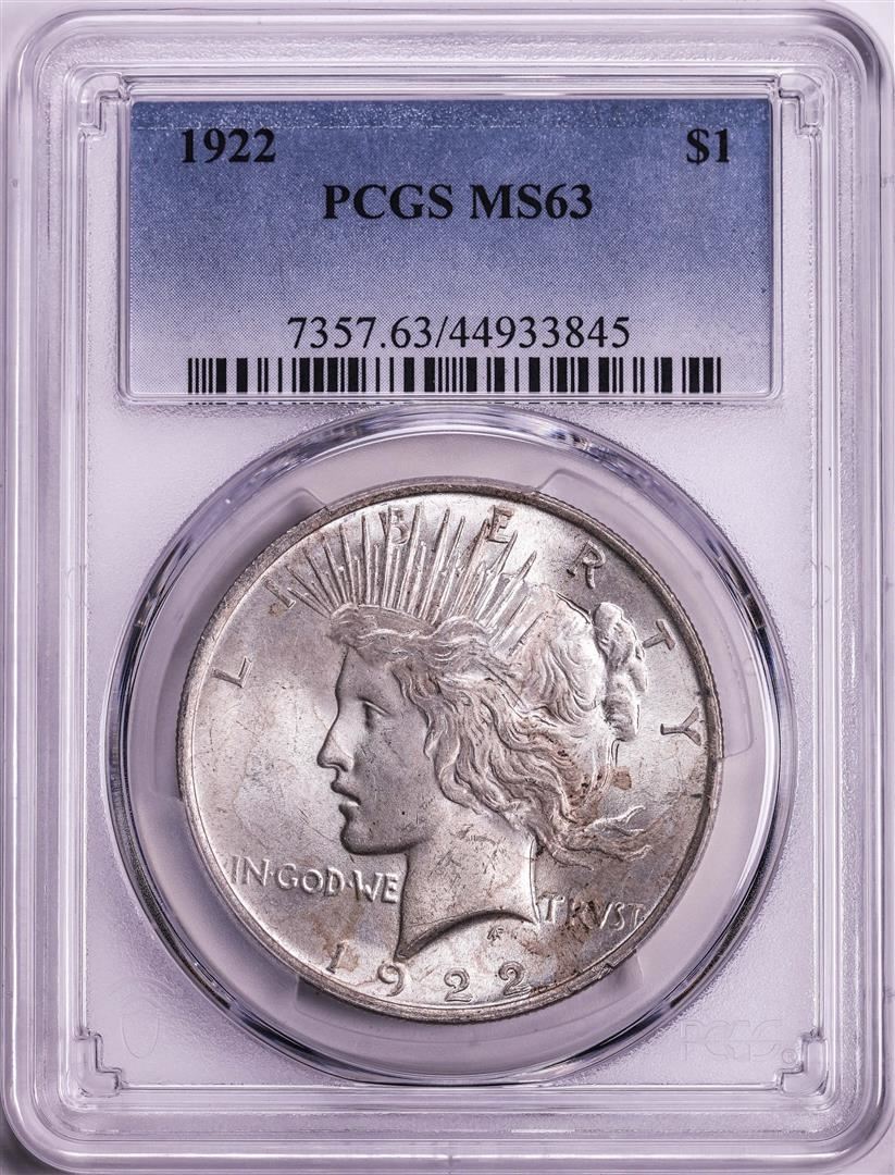 One 1922 $1 Peace Silver Dollar Coin PCGS MS63. PCGS Graded.