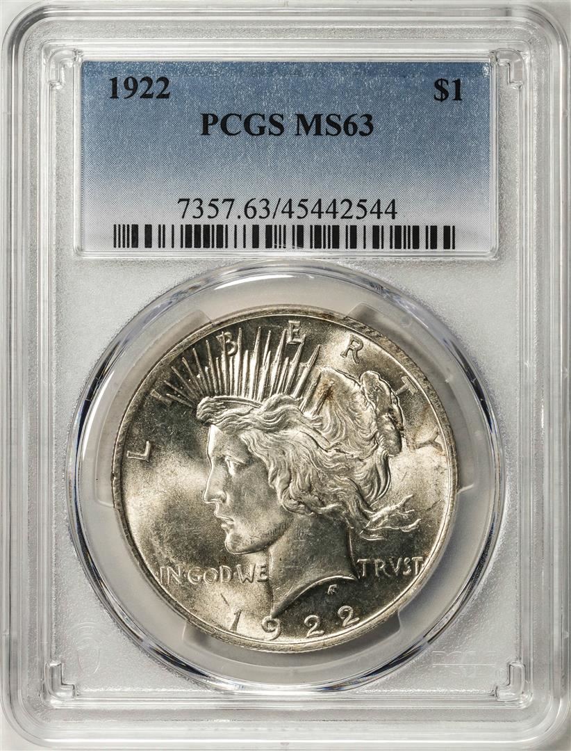 One 1922 $1 Peace Silver Dollar Coin PCGS MS63. PCGS Graded.