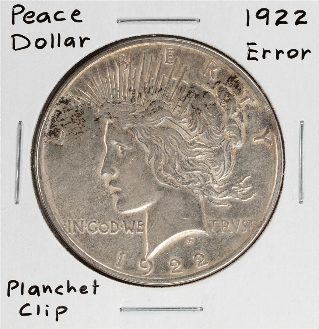 One 1922 $1 Peace Silver Dollar Coin Planchet Clip Error.