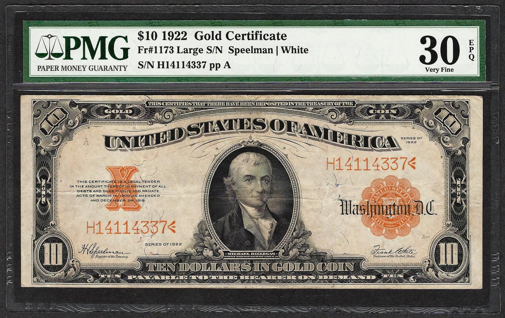 One 1922 $10 Gold Certificate Note Fr.1173 Large S/N PMG Very Fine 30EPQ. PMG Certified.