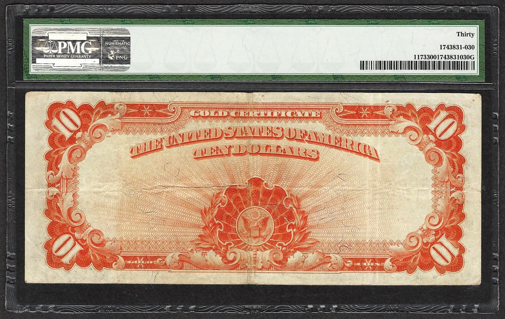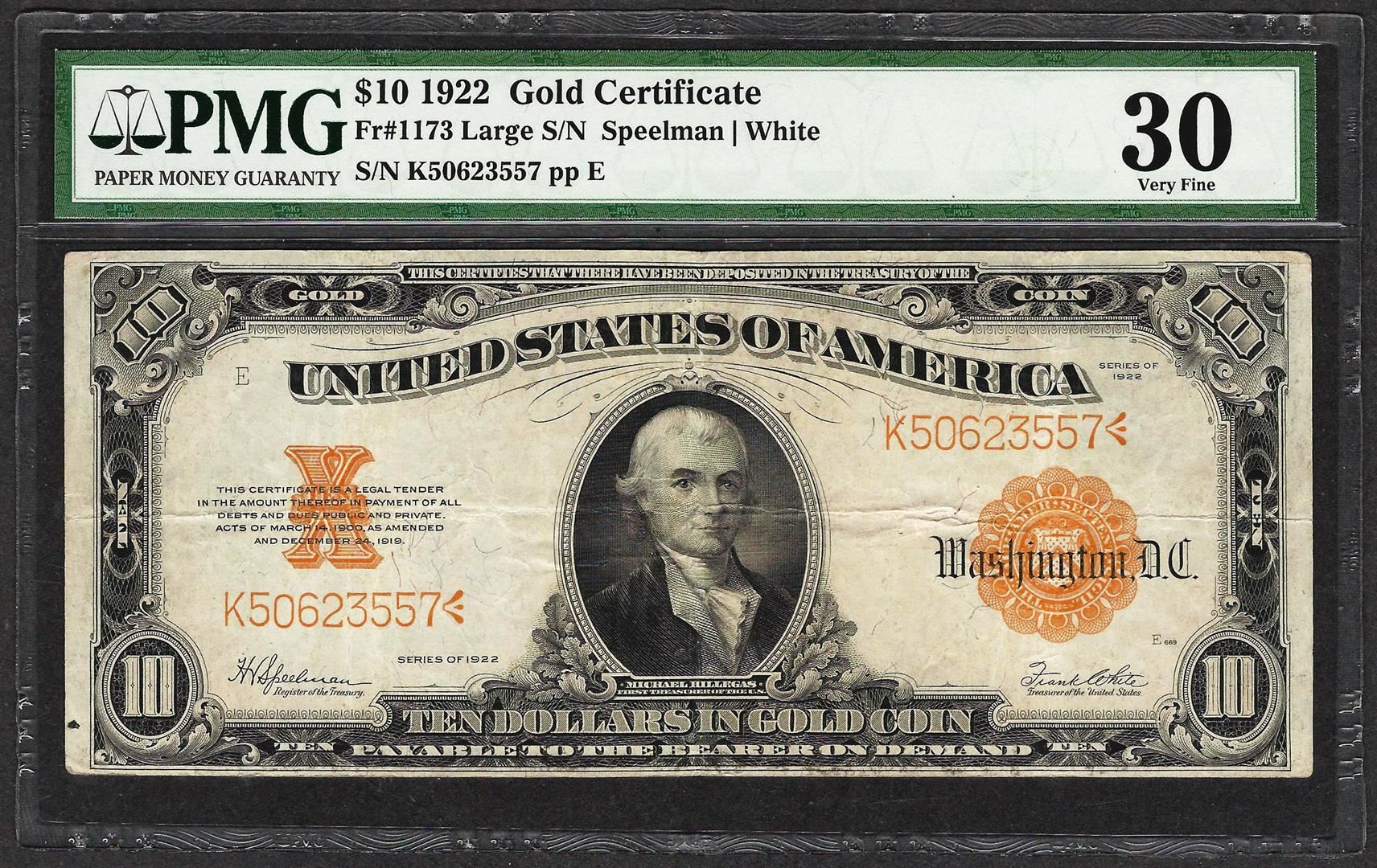 1922 $10 Gold Certificate Note Fr.1173 Large S/N PMG Very Fine 30