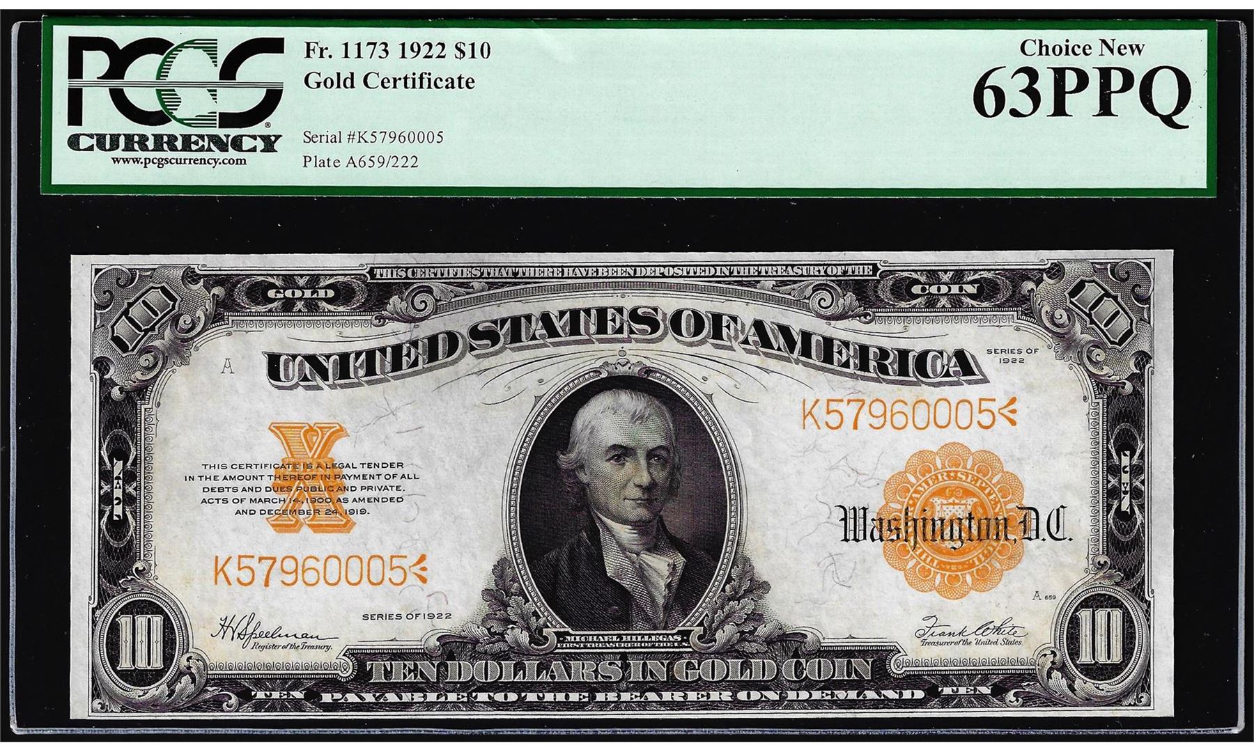 One 1922 $10 Gold Certificate Note Fr.1173 PCGS Choice New 63PPQ. PCGS Graded.