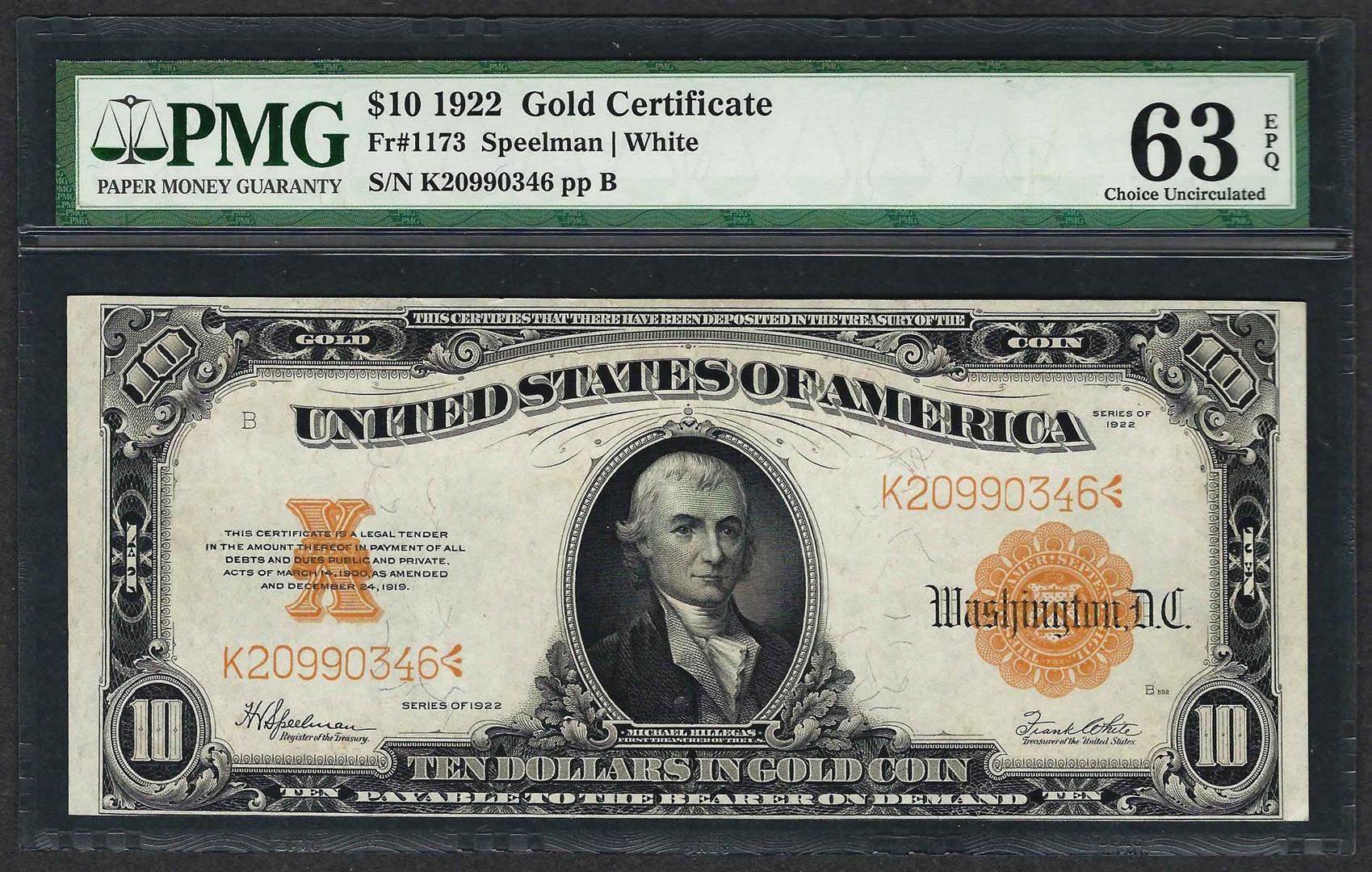 One 1922 $10 Gold Certificate Note Fr.1173 PMG Choice Uncirculated 63EPQ. PMG Certified.