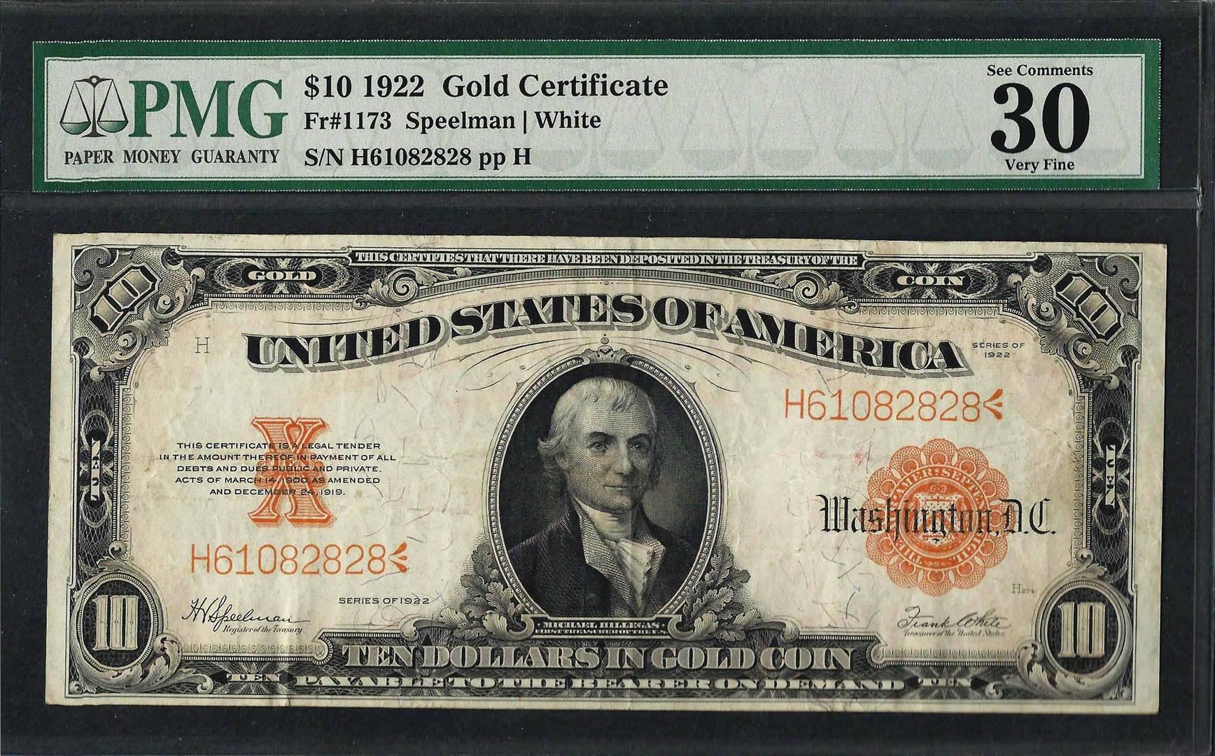 One 1922 $10 Gold Certificate Note Fr.1173 PMG Choice Very Fine 30EPQ. PMG Certified.