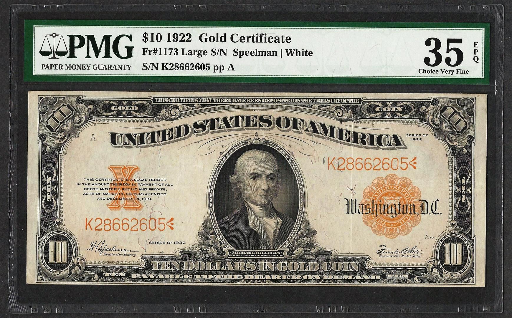 One 1922 $10 Gold Certificate Note Fr.1173 PMG Choice Very Fine 35EPQ. PMG Certified.