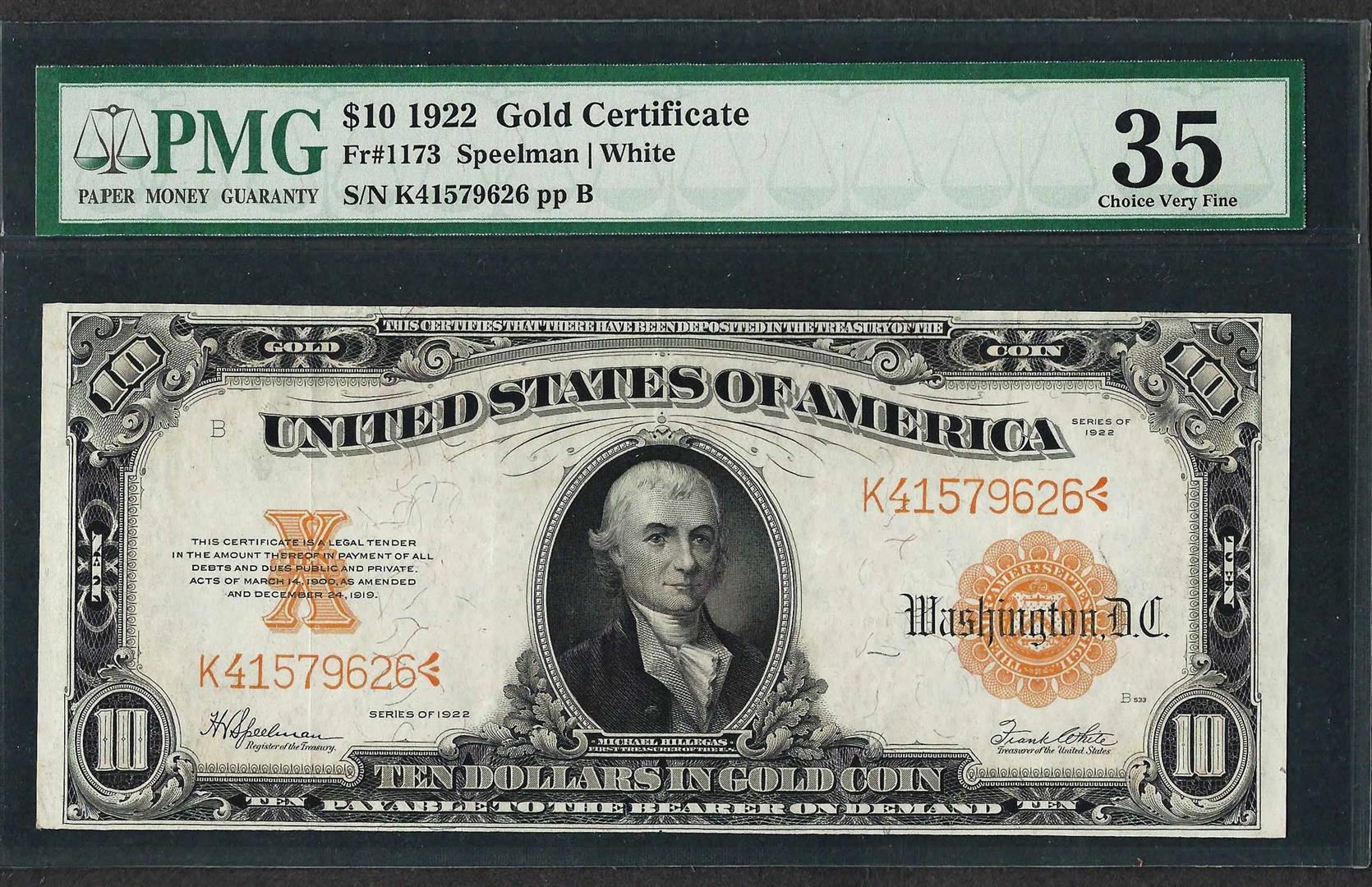 One 1922 $10 Gold Certificate Note Fr.1173 PMG Choice Very Fine 35. PMG Certified.