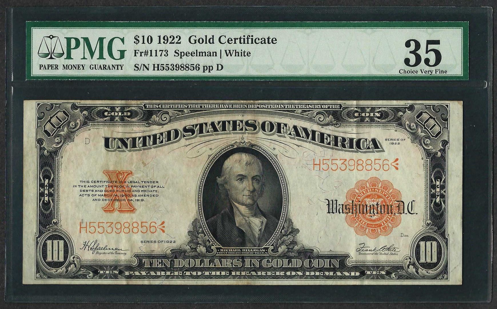 One 1922 $10 Gold Certificate Note Fr.1173 PMG Choice Very Fine 35. PMG Certified.