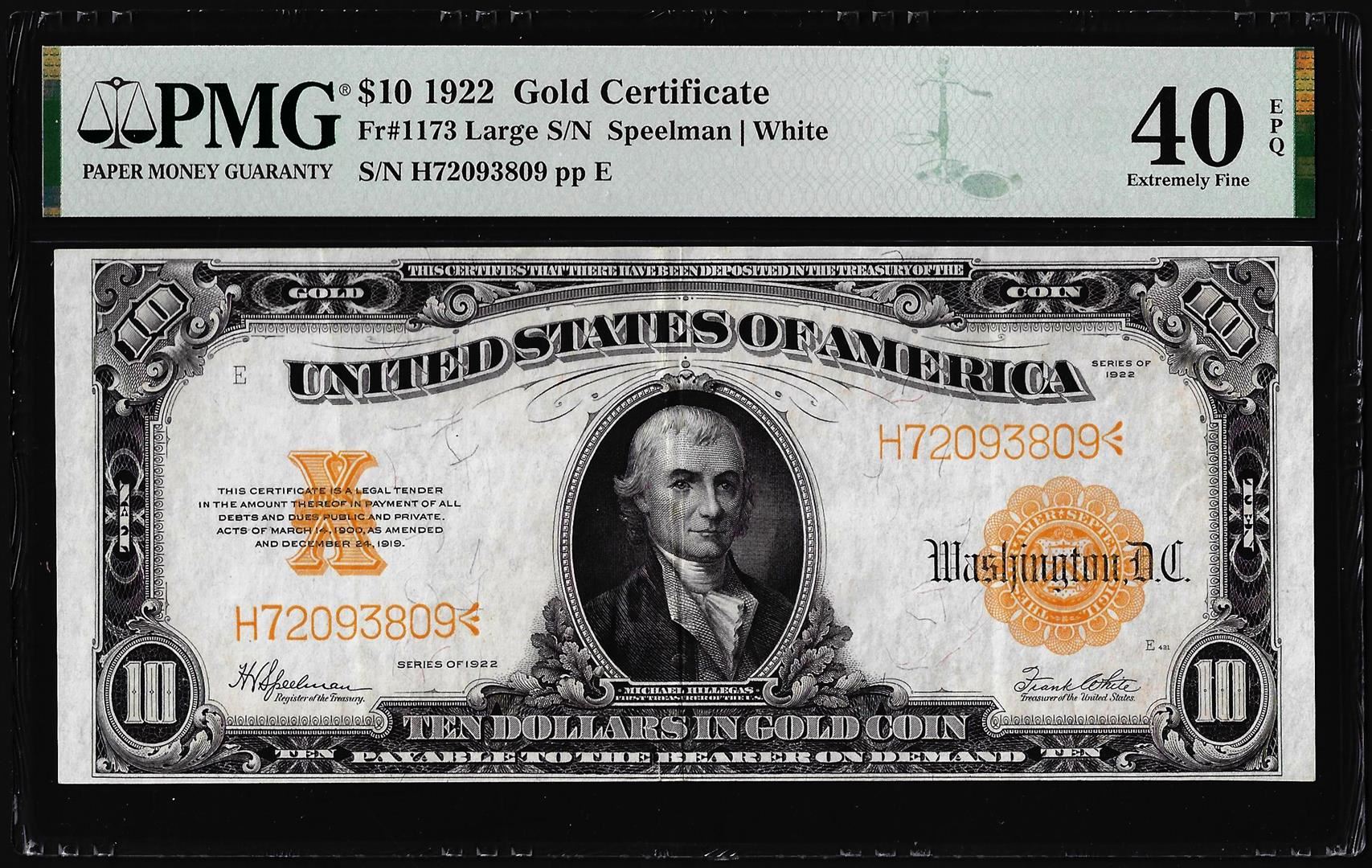 One 1922 $10 Gold Certificate Note Fr.1173 PMG Extremely Fine 40EPQ. PMG Certified.