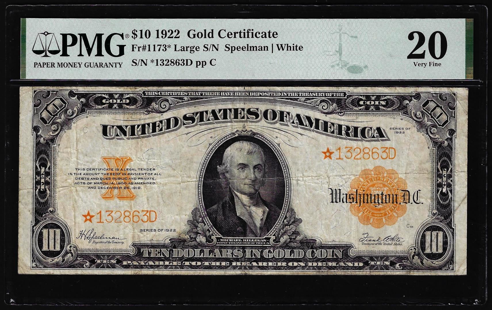 One 1922 $10 Gold Certificate Star Note Fr.1173* PMG Very Fine 20. PMG Certified.