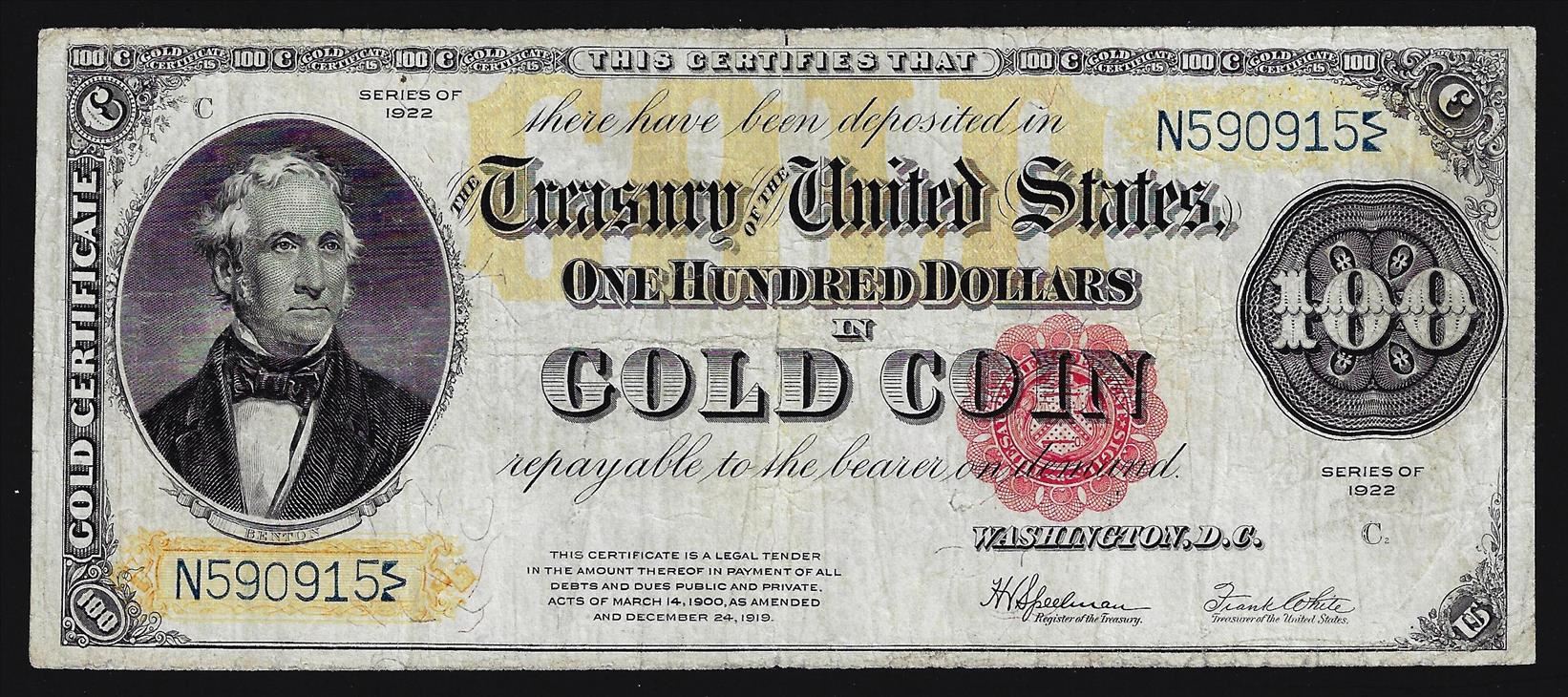 One 1922 $100 Gold Certificate Note Fr. 1215.