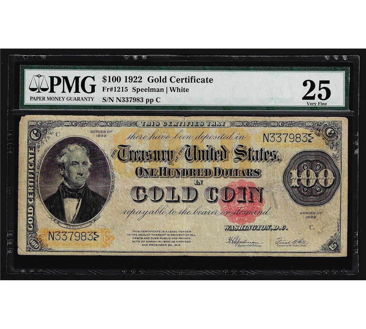 1922 $100 Large Size Gold Certificate Coin Note PMG Graded VF25