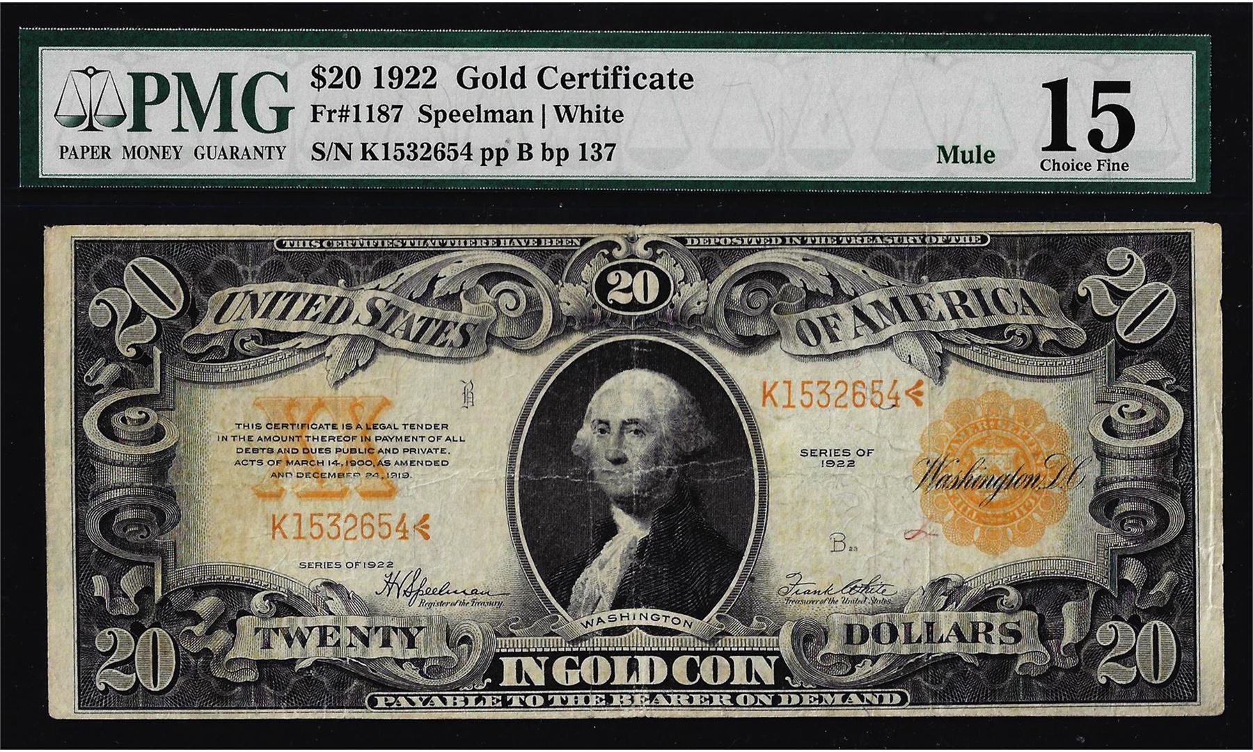 One 1922 $20 Gold Certificate Note Fr.1187 Mule PMG Choice Fine 15. PMG Certified.