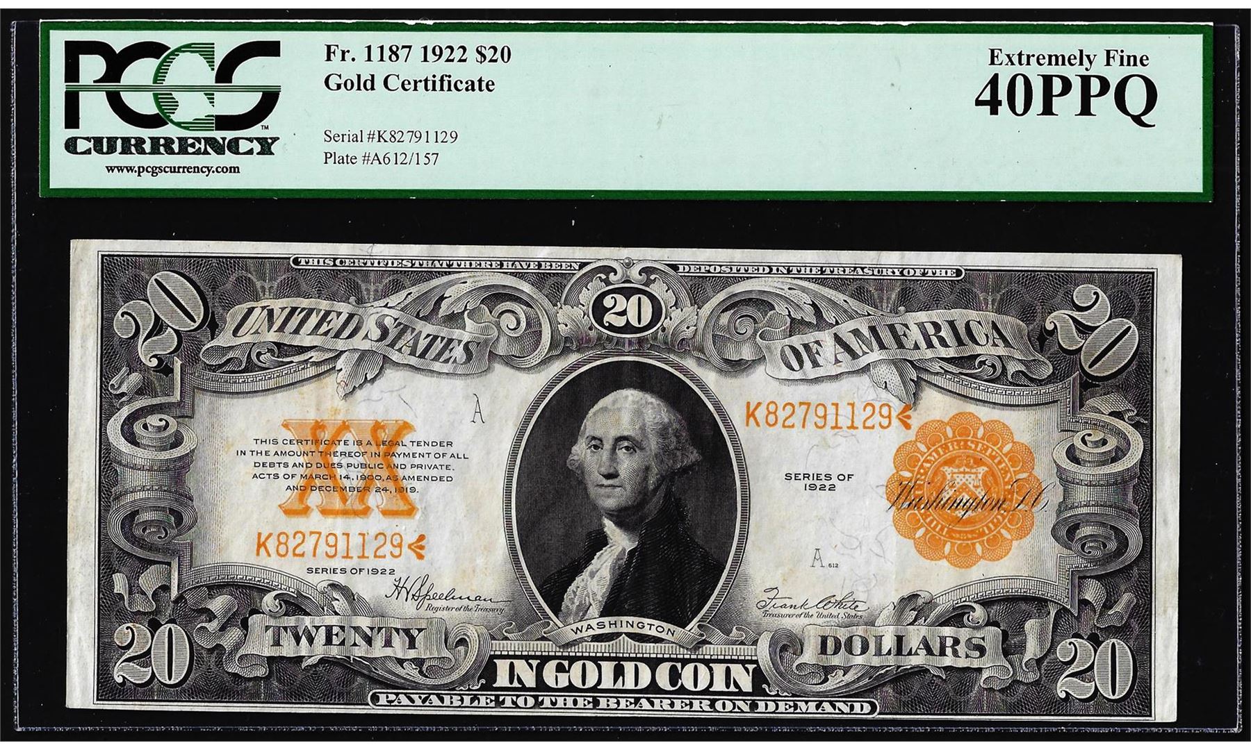 One 1922 $20 Gold Certificate Note Fr.1187 PCGS Extremely Fine 40PPQ. PCGS Graded.